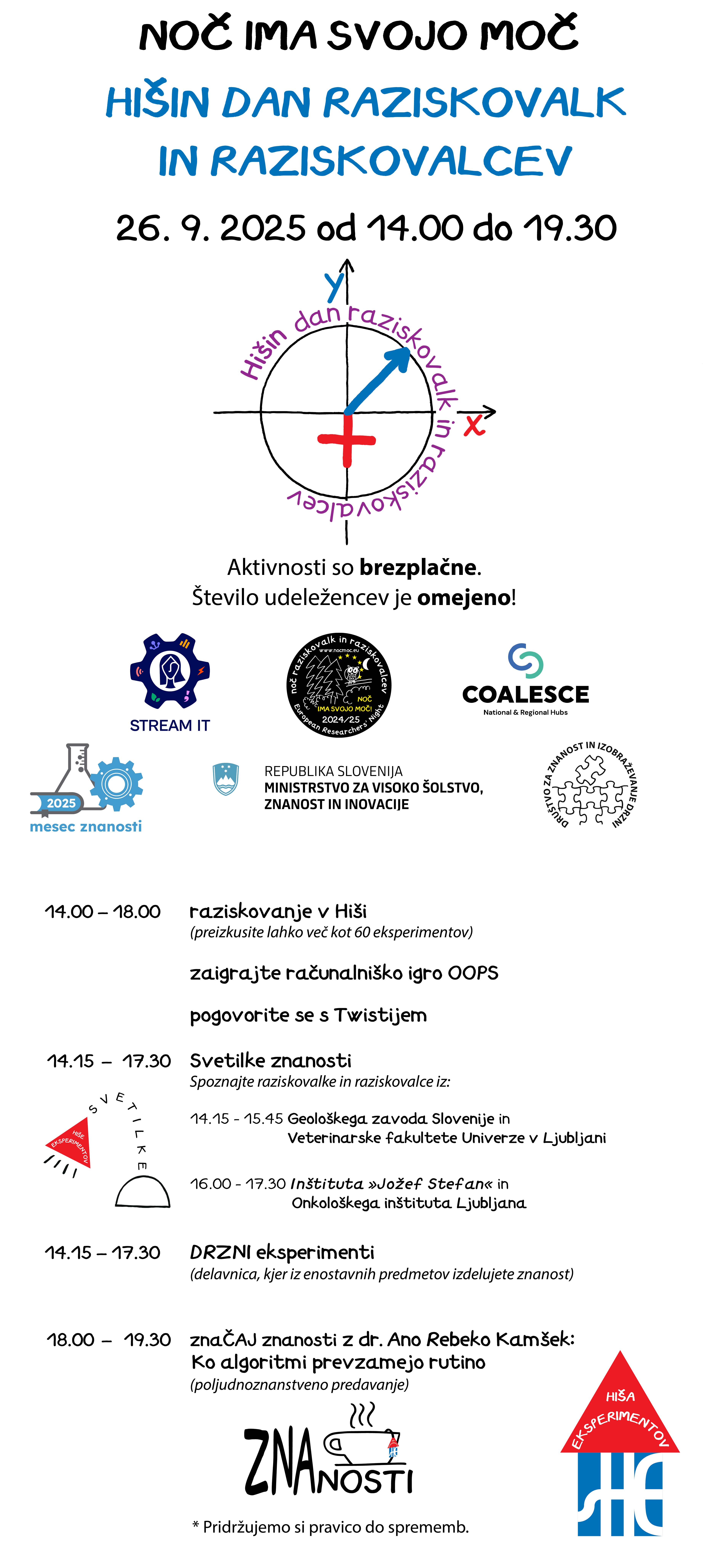 V Hiši eksperimentov bomo netili iskrice vedoželjnosti in radovednosti dopoldan in popoldan. Dopoldanski program je namenjen šolam. Od 14. ure naprej se boste lahko udeležili pogovorov z raziskovalkami in raziskovalci ter eksperimentov polnih delavnic. Hiša eksperimentov bo na ta dan za vas brezplačno odprla vrata. Število obiskovalcev bo zaradi prostorske stiske omejeno.